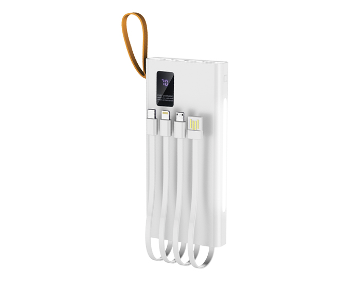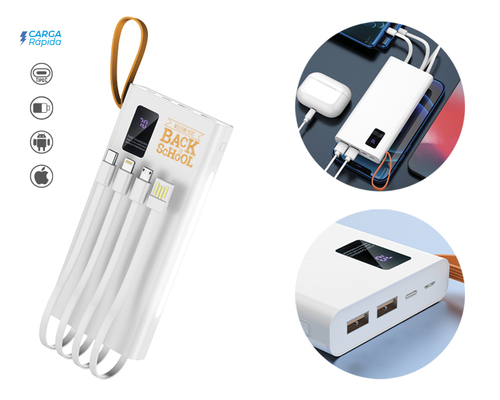 Descripción: Batería portátil 4 en 1 de carga rápida (22.5W) con capacidad de 10,000 mAh, con asa de silicón para transportar. Cuenta con botón de encendido/apagado, pantalla LED que indica el porcentaje de carga, linterna LED, 2 puertos de carga USB, 1 puerto de carga tipo C, 1 puerto de carga micro USB. Incluye 4 cables de salida para cargar dispositivos móviles: 1 cable para iPhone, 1 cable USB, 1 cable micro USB, 1 cable tipo C. Compatible con dispositivos Android e iOS. Presentación: Caja de regalo a color.
