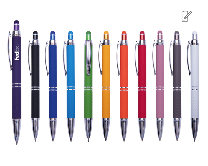 Descripción: Bolígrafo metálico con acabado brillante y elegante diseño. Punta touch de malla metálica firmemente tejida para un rendimiento superior y preciso en dispositivos táctiles. Mecanismo twist, que al girar indica el color de tinta el cual puede ser azul o negro. Presentación: caja en color negro.