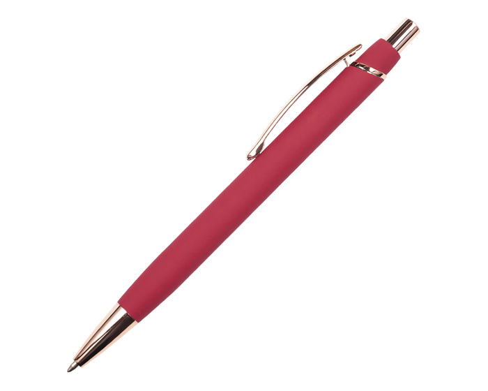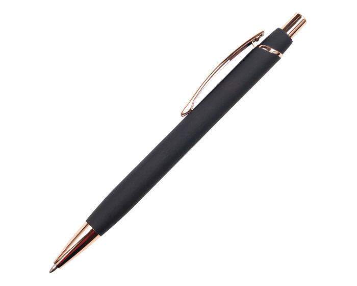 Descripción: Bolígrafo de aluminio con mecanismo de click, acabado de goma suave al tacto y detalles en oro rosa (punta, clip y botón). Al grabar en laser CO2, destapa en color oro rosa.