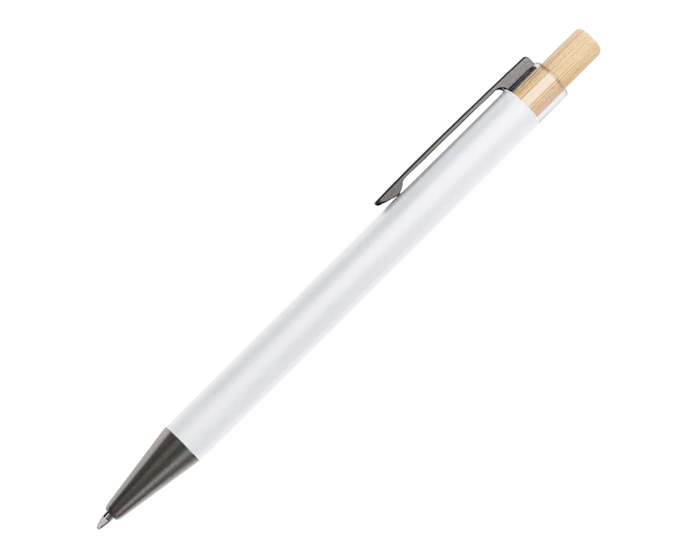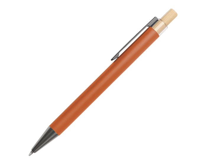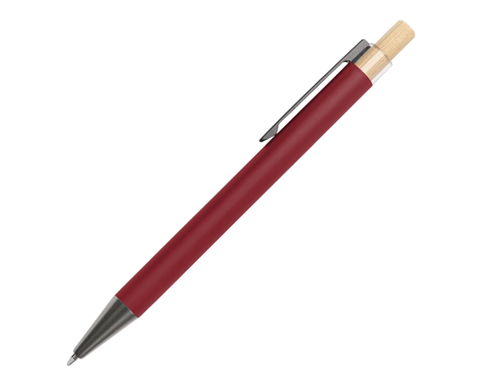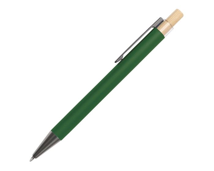 Descripción: Bolígrafo de aluminio con mecanismo de click, acabado tipo rubber, tiene botón de bambú y detalle de plástico transparente donde se sujeta el clip metálico; clip y punta en color grafito.