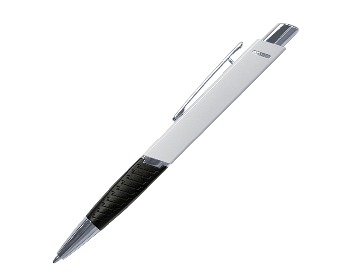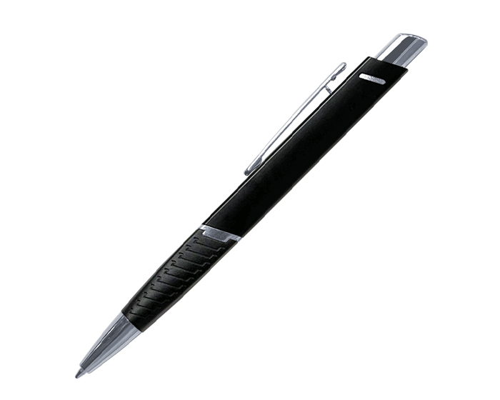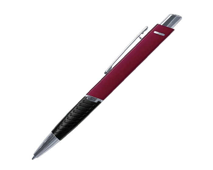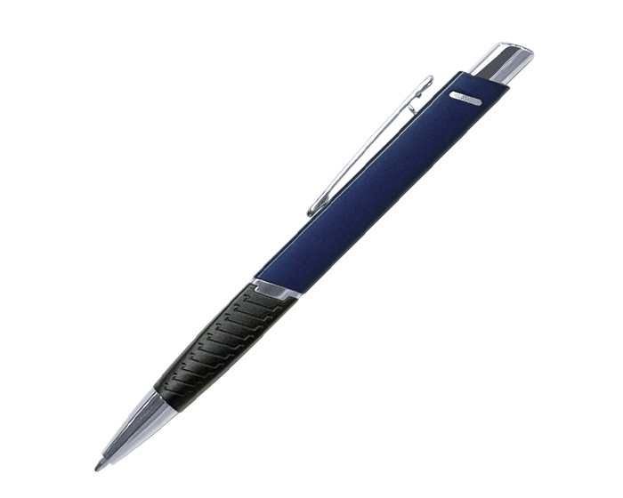 Bolígrafo de aluminio con forma cuadrada, con excelente área para personalizar. Cuenta con punta, clip, aro central y botón en cromo, grip negro con textura. Tinta alemana negra. Mecanismo de click.