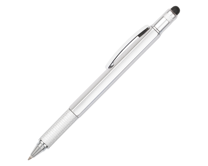 Descripción: Bolígrafo de plástico 6 en 1, diseño de cuerpo hexagonal que cuenta con regla de 7 cm y 3 pulgadas, nivelador y clip de metal. Puntero para pantallas táctiles. Incluye punta destornillador plano y de cruz, que se guarda y fija en el cuerpo de la pluma. Mecanismo retráctil.