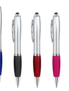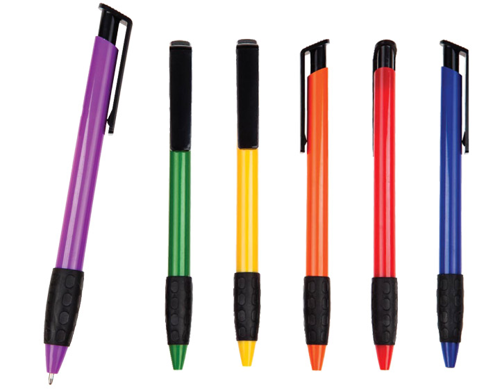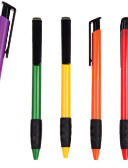 Descripción: Bolígrafo 5 en 1: lapicero, tinta roja, azul, negra y verde; con goma en el extremo superior. Mecanismo deslizante para cambio de tinta.