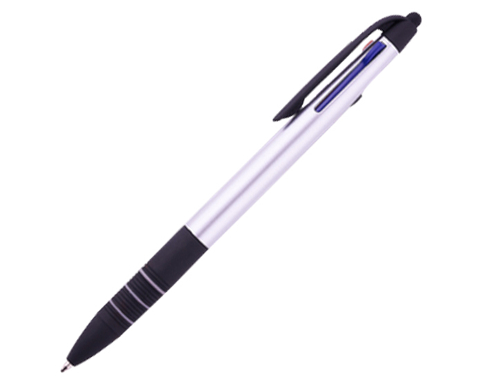 Bolígrafo plástico con terminado metalizado. Tiene integradas 3 tintas: negra, roja y azul. Parte inferior con goma antideslizante en negro con detalles de arillos en gris. Cuenta con touch para dispositivos táctiles….