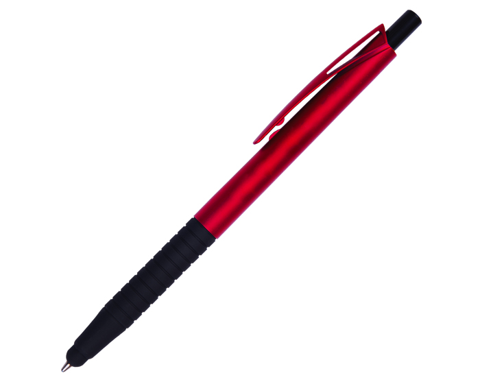 Bolígrafo de plástico en colores metálicos, punta touch y goma antideslizante. Mecanismo de click.