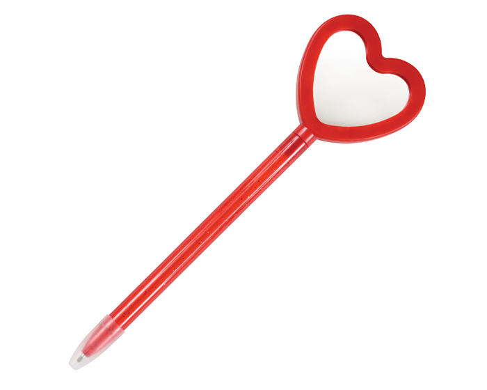 Bolígrafo delgado de plástico traslucido con cuerpo de glitter y forma de corazón con espejo.