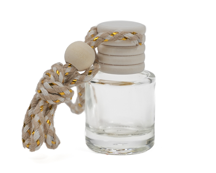 Descripción: Botella difusora de vidrio de 5 ml. para aceites aromáticos o fragancias, la tapa de madera se impregna y desprende el aroma contenido. Ideal para coches, closets o lugares pequeños. Cuenta con cinta ajustable para colgarse. NO incluye fragancia.