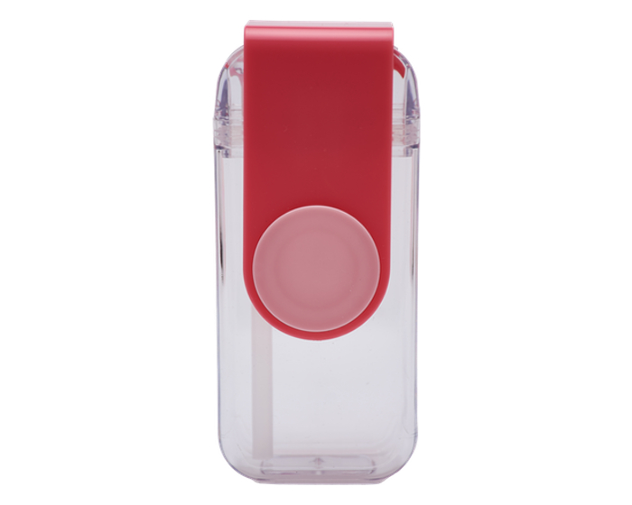 Descripción: Cilindro de plástico transparente con diseño en forma de “cajita para jugo”. Cuenta con asa giratoria en color pastel, la cual al deslizarse hacia un lado permite que se expulse el popote. Al regresar el asa a la posición vertical, el popote vuelve a colocarse en su lugar. El popote es de silicón, no tóxico. La tapa sella a presión y cuenta con seguro para líquidos. CAP. 280 ml. Presentación: caja en color blanco.