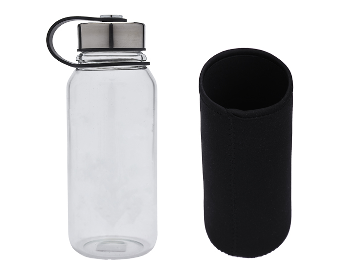 Descripción: Cilindro de vidrio de borosilicato, de mayor resistencia ante el calor y los cambios de temperatura. Con tapa de rosca metálica, agarradera y funda protectora de neopreno. Para consumir bebidas de manera saludable, sin alterar el sabor o composición de los líquidos. CAP. 1000 ml. Presentación: caja en color negro.
