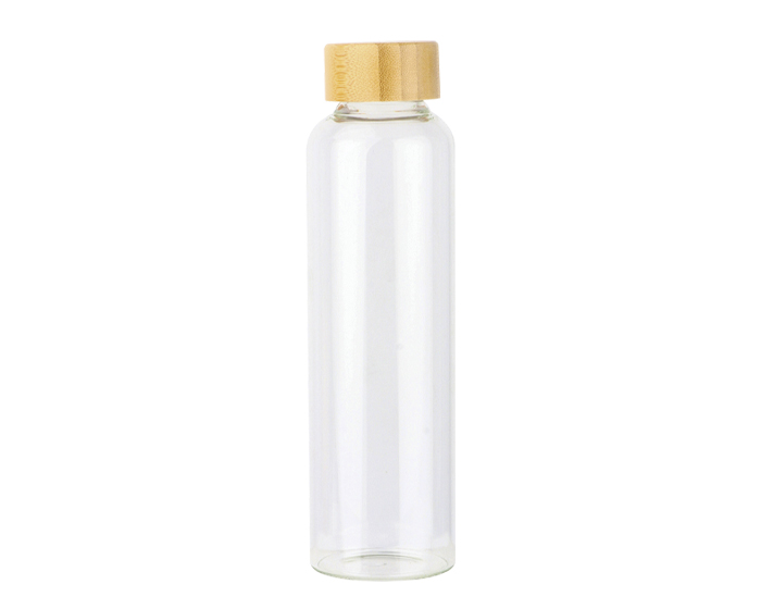Descripción: Cilindro de vidrio de borosilicato con tapa de rosca de bambú. CAP. 600 ml. Presentación: caja en color negro.