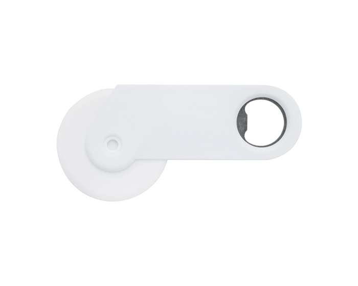 Cortador de plástico para pizza con destapador de metal para botellas.