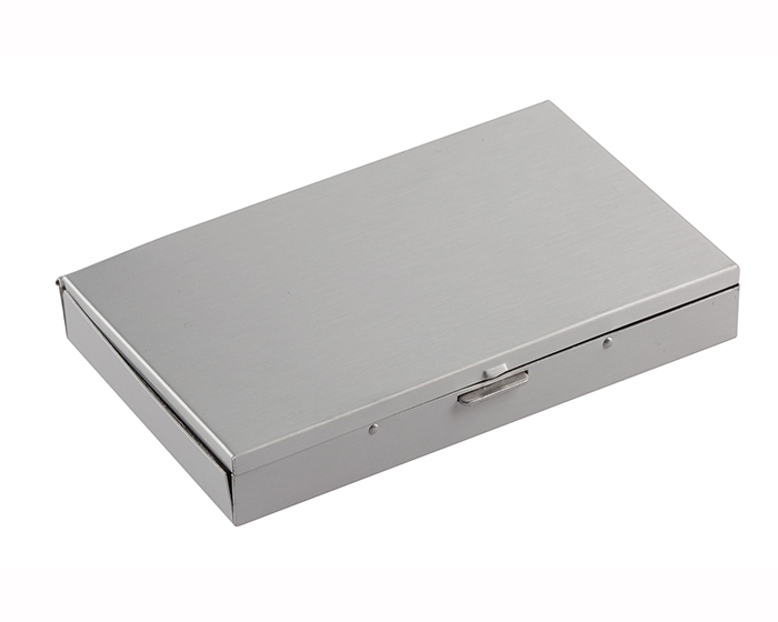 Mini estuche de dominó con piezas en aluminio grabadas. La caja cierra a presión.
