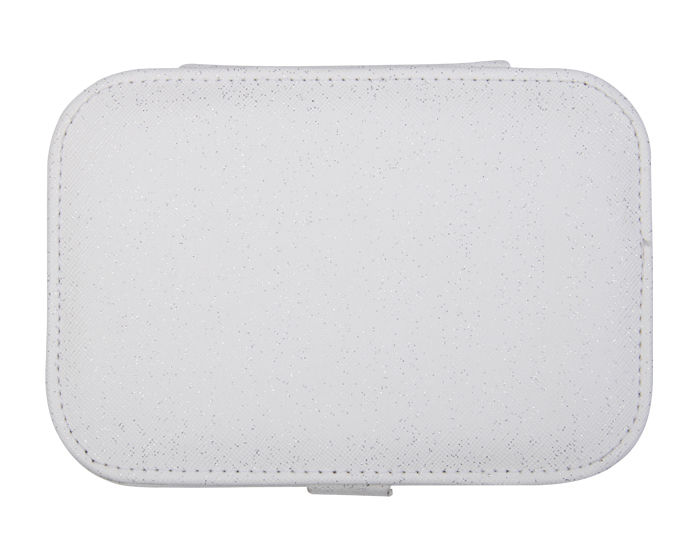 Descripción: Estuche organizador de joyas. Cuenta con 5 ganchos para colgar collares o pulseras, bolsa interna con elástico, panel en la parte intermedia, ranuras y compartimentos para diversos accesorios. Cierre con broche a presión.