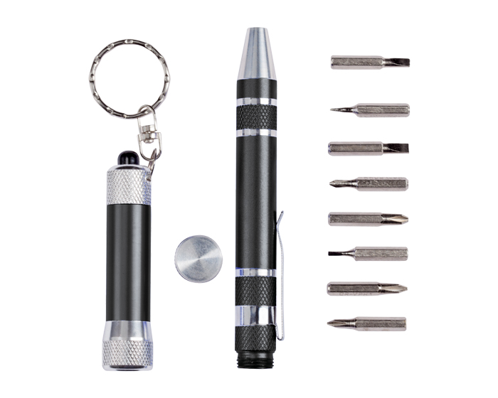 Descripción: Juego de desarmador y lámpara portátil de aluminio. El desarmador contiene 8 puntas de destornilladores de precisión y clip para sujetarse a la camisa. Incluye: lámpara con arillo de llavero, botón de encendido a presión. Utiliza 4 pilas incluidas. Presentación: caja en color negro.
