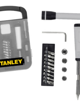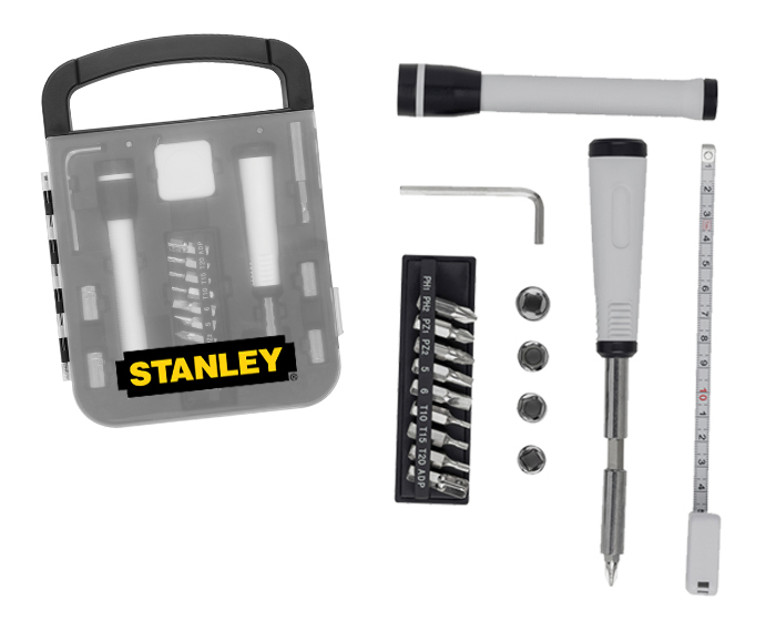 Descripción: Estuche portátil de herramientas con cierre. Cuenta con espacio para 12 accesorios. Incluye: pinzas de punta, pinzas de precisión, 4 dados, extensión y maneral, 10 puntas de desarmador y 6 desarmadores de relojero. Presentación: caja en color negro.