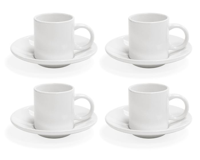 Juego de café o té para sublimar, incluye 4 tazas con su plato. CAP. 90 ml. (3 OZ). Presentación: caja en color Kraft.