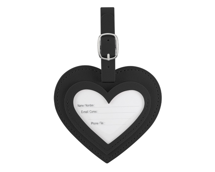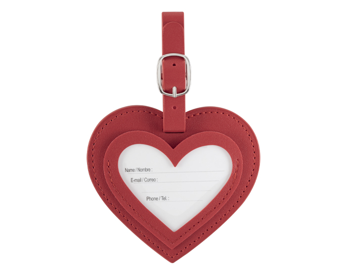 Descripción: Identificador de equipaje de PU en forma de corazón. Cuenta con una pulsera ajustable para el equipaje y tarjeta para datos personales en español/inglés.