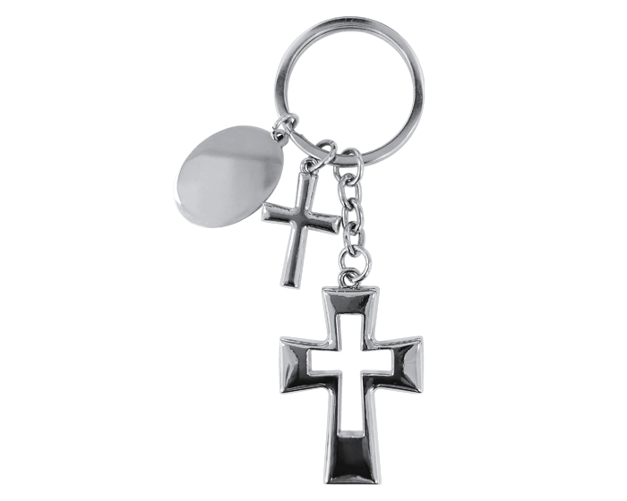 Descripción: Llavero con 2 cruces y placa de aleación de zinc y arillo reforzado. Presentación: Caja individual de cartón en color negro.