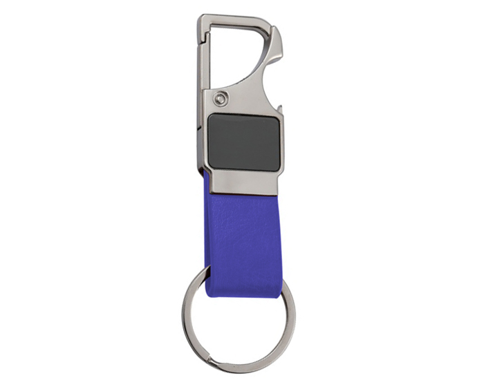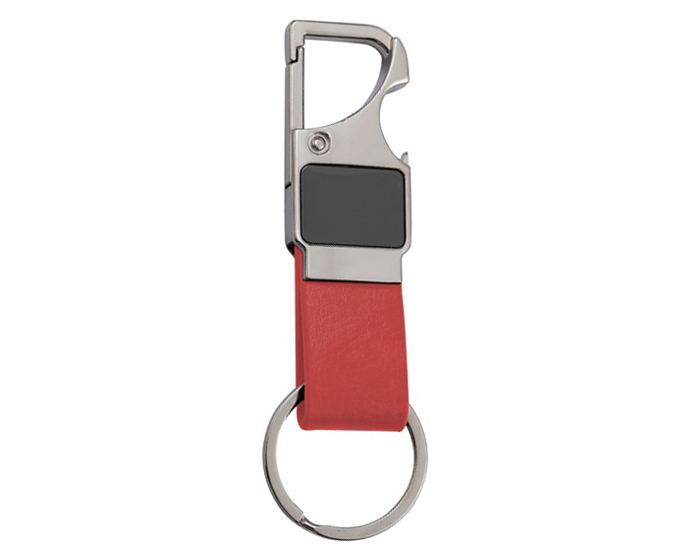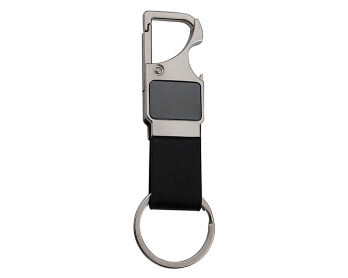 Descripción: Llavero metálico multifuncional con correa de PU, gancho para colgarse y destapador. Presentación: caja individual.