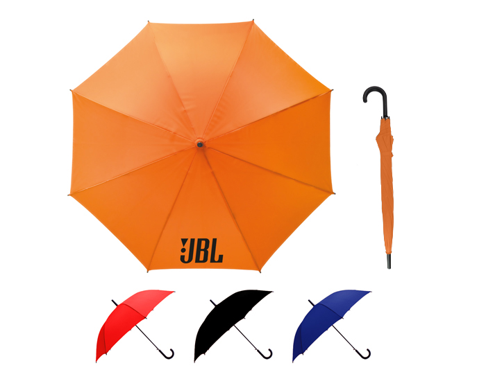 Descripción: Paraguas antiviento con botón de apertura automático, varillas de fibra de vidrio, eje de metal y mango de plástico. 8 gajos.