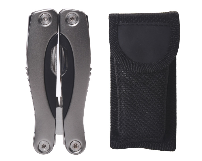 Descripción: Herramienta plegable con 9 funciones: pinzas de punta, navaja, dos desarmadores planos y un desarmador de cruz, sierra, destapador doble, abrelatas y lima. Con superficie antideslizante para mejor manipulación. Cuenta con seguro de bloqueo para fijar cada herramienta. Incluye estuche. Presentación: caja en color negro.