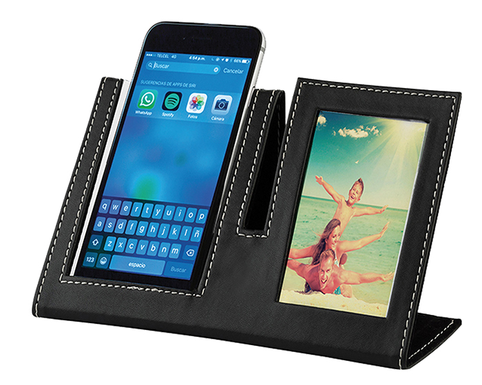 Descripción: Portarretrato con base para celular y ventana de PVC para insertar foto. Ideal para colocar en escritorio. Presentación: caja en color blanco.