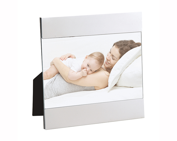 Descripción: Portarretrato de aluminio con soporte plegable. Incluye vidrio de 3 mm de espesor. Presentación: caja en color blanco.