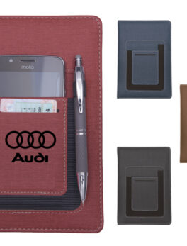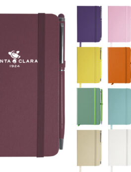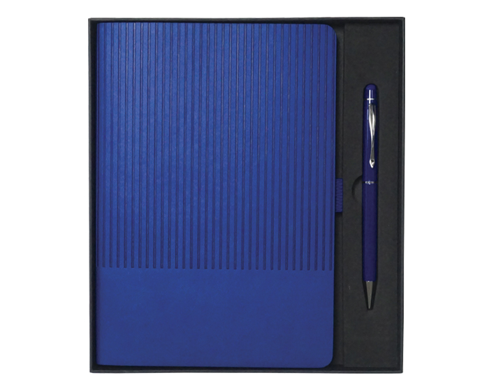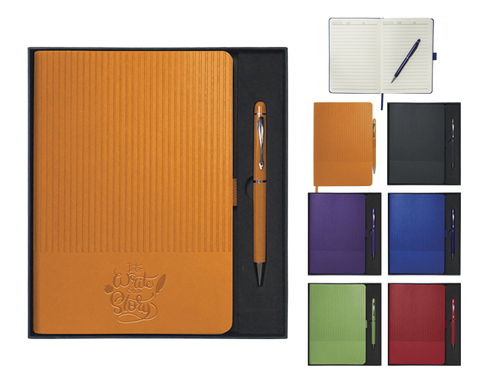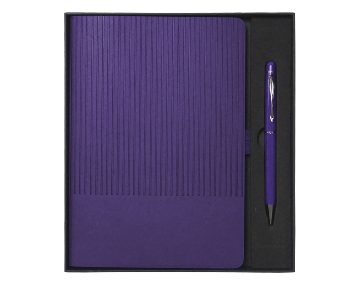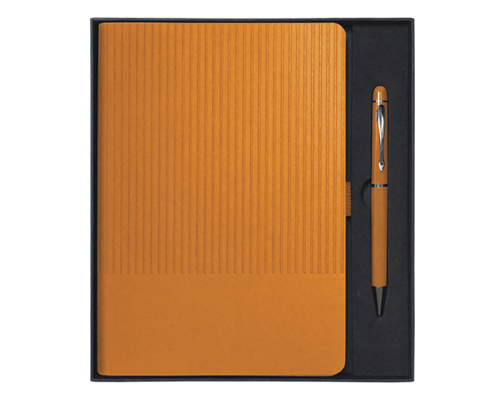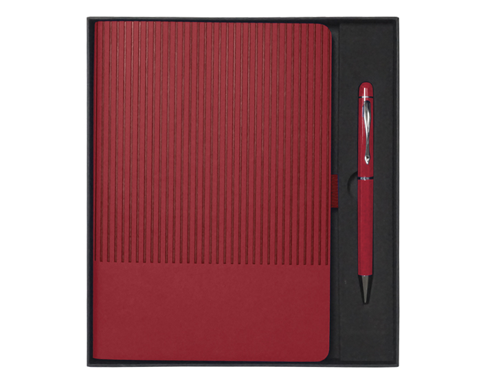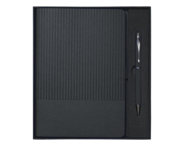 Descripción: Set de libreta con bolígrafo metálico. La libreta cuenta con pasta flexible, con textura de líneas verticales en la parte superior y área lisa en la parte inferior para poder personalizarse fácilmente. Es de 96 hojas rayadas (192 páginas), papel de 80 gr. color crema. Tiene listón separador en color de la pasta. Incluye bolígrafo de aluminio del color de la libreta con touch screen y detalles en cromo. Presentación: Caja de regalo en color negro.