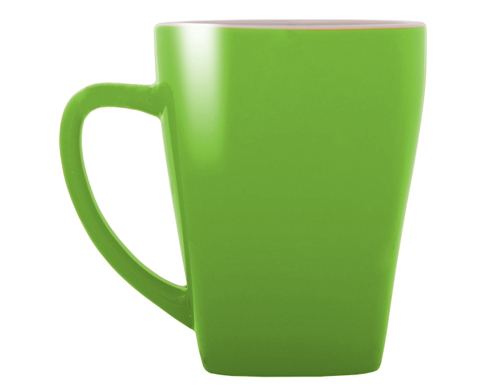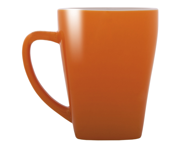Taza con base cuadrada y borde superior redondo, exterior a color semi mate e interior blanco brillante. CAP. 12 OZ. Venta en múltiplos de 12.