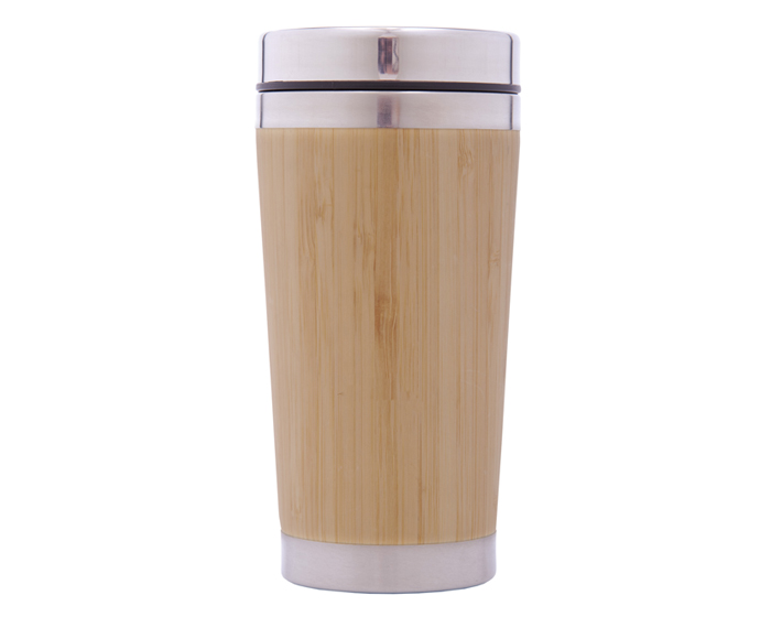 Descripción: Termo de doble pared de acero inoxidable con exterior de bambú. Tapa a presión con seguro deslizable. CAP. 445 ml. Presentación: Caja en color blanco.