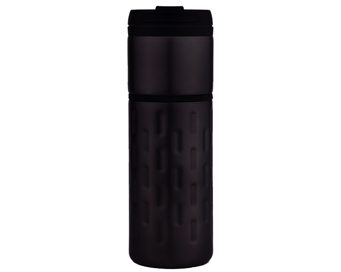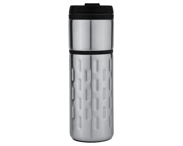 Descripción: Termo metálico de acero inoxidable con interior de plástico. Tapa de rosca hermética abatible con boquilla y hendidura, para beber cómodamente los líquidos sin que se derramen. Cintillo intermedio de silicón. Cuerpo diseñado con finos detalles en relieve que le dan un toque elegante y de presencia. CAP. 470 ml. Presentación: caja en color blanco.