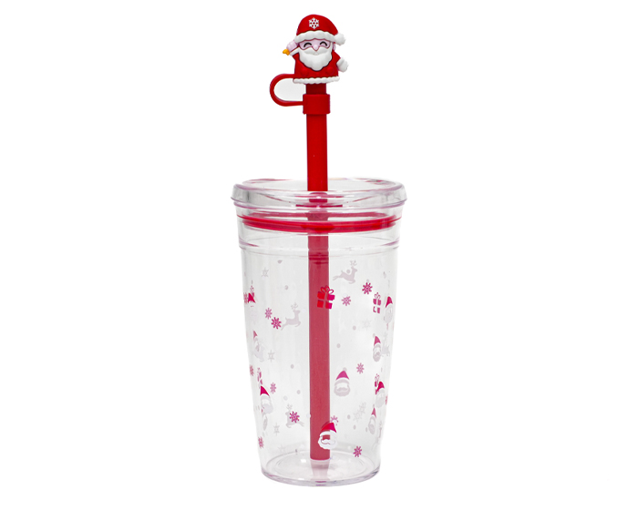 Descripción: Vaso coleccionable de plástico transparente con motivos de Navidad, cuenta con tapa a presión anti derrames, sellos de silicón y popote rojo con protector de popote en forma de Santa Claus. Es ideal para bebidas frías. CAP. 450ml. Presentación: Caja kraft.
