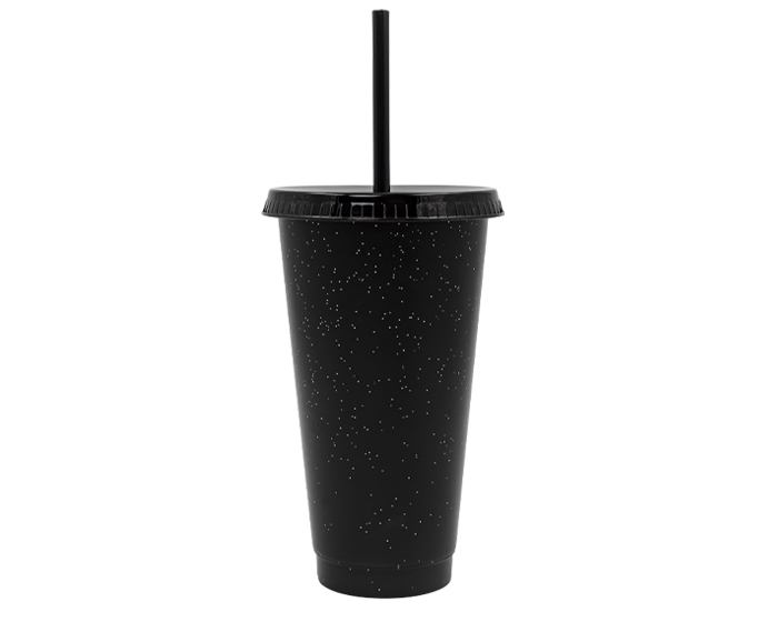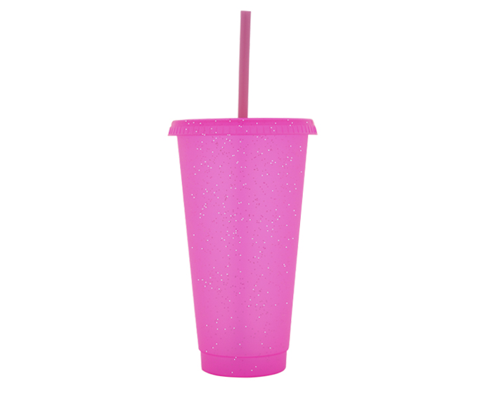 Descripción: Vaso de plástico con glitter plateado, cuenta con tapa a presión de color y popote en el mismo color del vaso. CAP. 750 ml.