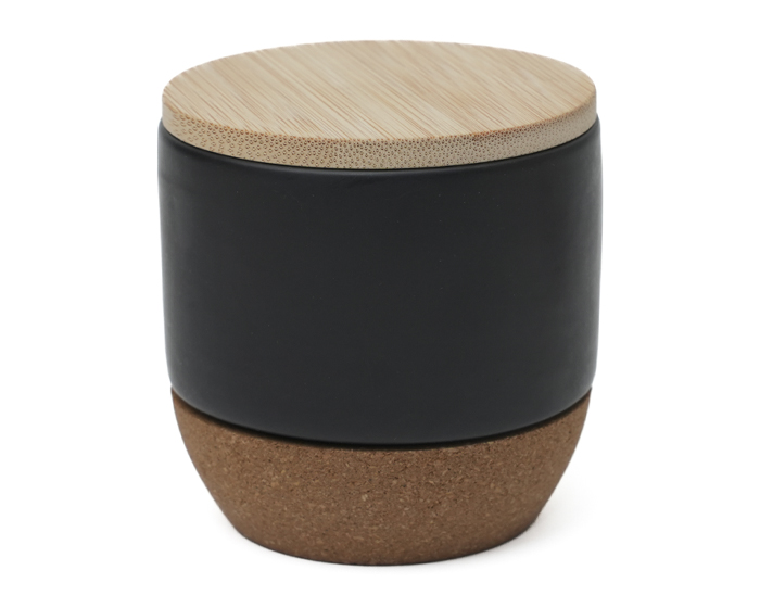 Descripción: Vela decorativa de cera blanca de soya con concentración de fragancia de vainilla al 2%, en tarro de cerámica con tapa de bambú y base de corcho. Presentación: caja individual.